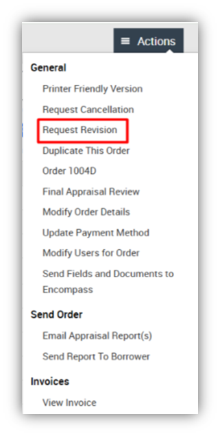 After Appraisal is Uploaded: While within the appraisal order, click on Actions à Request Revision. Follow the prompts to indicate what revision(s) are required: