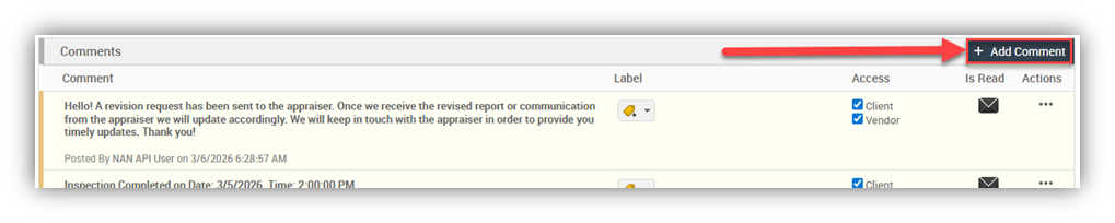 Requesting Revisions Revisions may be requested one of two ways. Prior to Appraisal Being Uploaded: While within the appraisal order, scroll down to the comments section. Add a comment indicating required revisions: